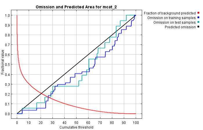| Cumulative threshold | Cloglog threshold | Description | Fractional predicted area | Training omission rate | Test omission rate | P-value |