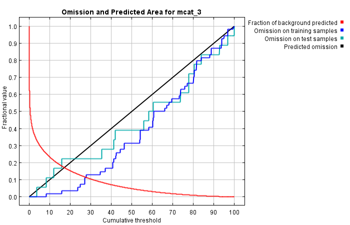 | Cumulative threshold | Cloglog threshold | Description | Fractional predicted area | Training omission rate | Test omission rate | P-value |