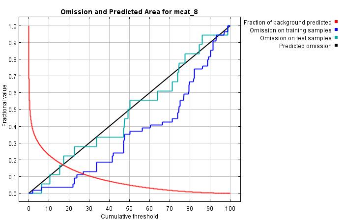 | Cumulative threshold | Cloglog threshold | Description | Fractional predicted area | Training omission rate | Test omission rate | P-value |