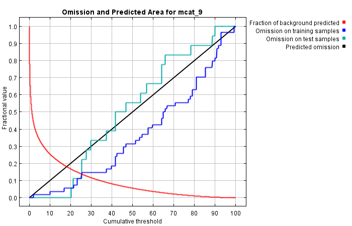| Cumulative threshold | Cloglog threshold | Description | Fractional predicted area | Training omission rate | Test omission rate | P-value |