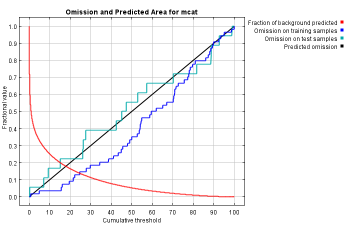 | Cumulative threshold | Cloglog threshold | Description | Fractional predicted area | Training omission rate | Test omission rate | P-value |